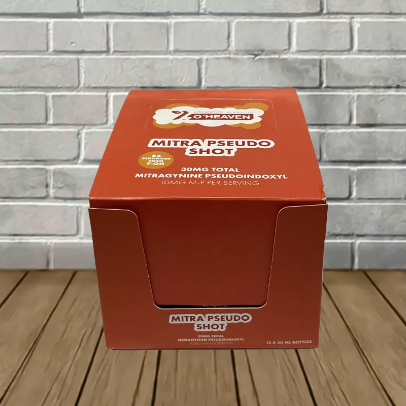 7 O’Heaven Mitra Pseudo Extract Shots come in a sealed, airtight 2oz glass bottle. Every bottle contains a highly concentrated and flavorful 30ml liquid extract. This liquid kratom extract shot was formulated to be consumed in three servings. Each serving contains 10mg of high-purity Mitragynine Pseudoindoxyl extract, for a total of 30 mg.