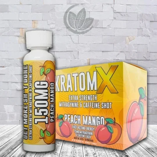KratomX Kratom + Caffeine Liquid Extract Shots come in a single 2oz resealable bottle or sealed 12ct display box. Every bottle is considered one serving and contains all-natural flavoring and a powerful 1:1 ratio blend of 75mg full spectrum kratom and 75mg caffeine.