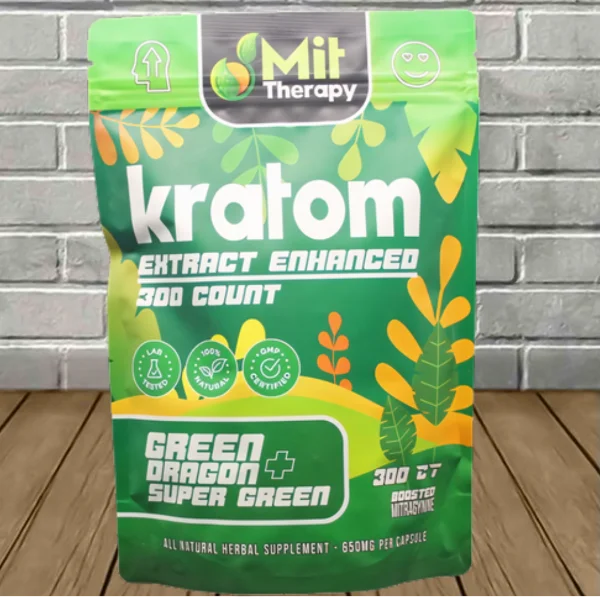 MIT Therapy Green Dragon + Super Green Enhanced Capsules come in an airtight resealable bag. Every capsule contains a potent and consistent 650mg blend of all-natural Green Dragon + Super Green plain leaf powder enhanced with a powerful kratom extract. These capsules come in varying options depending on user preference. This includes 90ct, 150ct, and 300ct options.