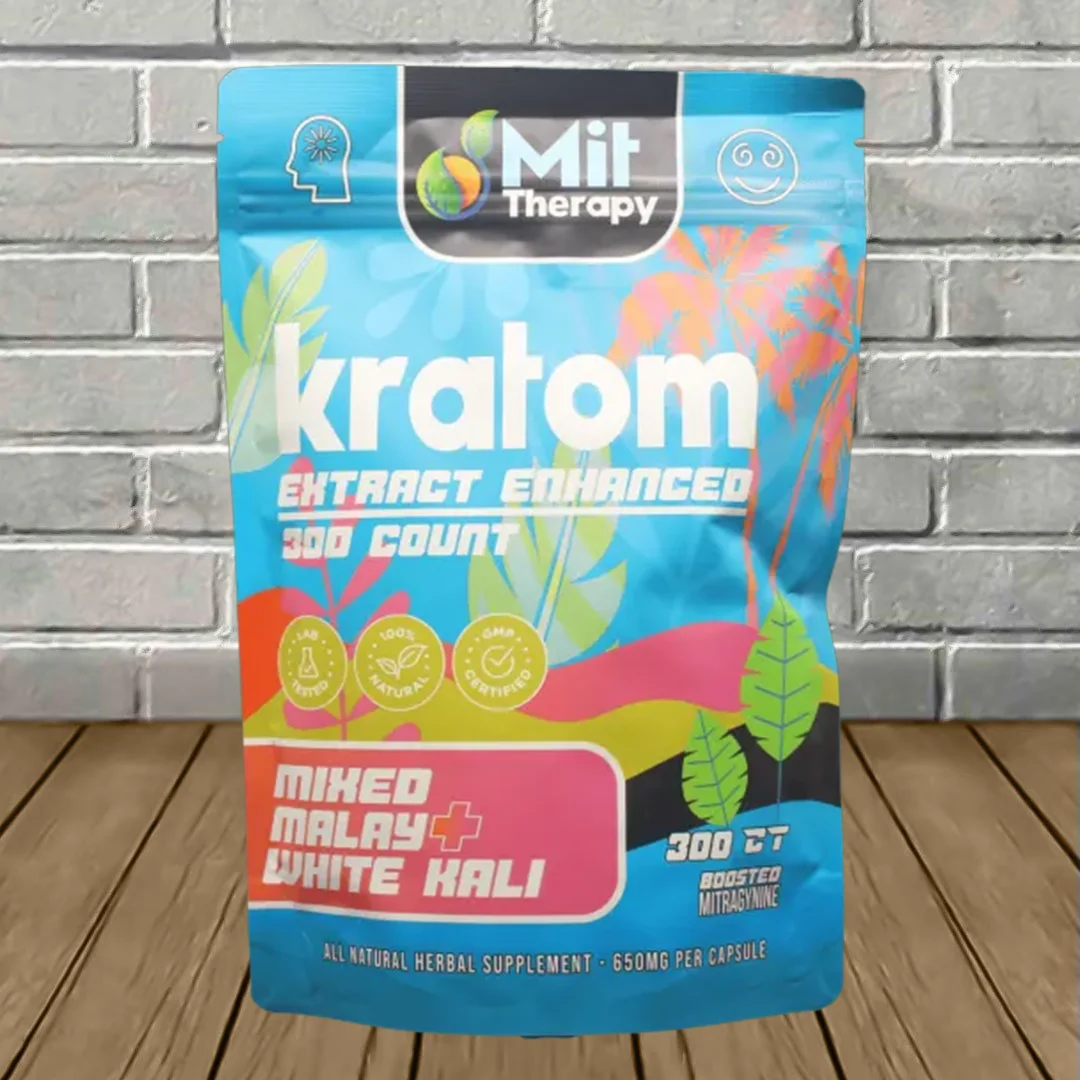 MIT Therapy Mixed Malay + White Kali Enhanced Capsules come in an airtight resealable bag. Every capsule contains a potent and consistent blend of all-natural Mixed Malay and White Kali plain leaf powder enhanced with a powerful kratom extract. These capsules come in varying options depending on user preference. This includes 90ct, 150ct, and 300ct options.