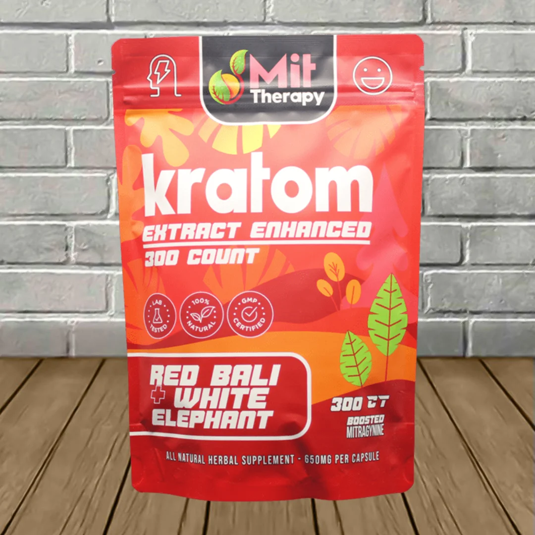 MIT Therapy Red Bali + White Elephant Enhanced Capsules come in a resealable bag. Every capsule contains a 650mg proprietary blend of all-natural Red Bali and White Elephant plain leaf enhanced with potent extract. Like most kratom brands, these capsules come in varying options depending on user preference. These specific capsules come in 90ct, 150ct, and 300ct options.