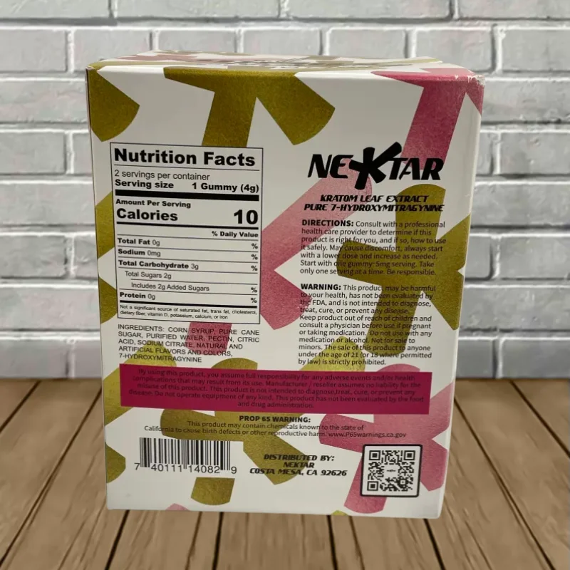 Nektar Micro 7’s 7-Hydroxy Extract Gummies come in a 30ct display box filled with 2ct single-use sachets. Every sachet includes two mouthwateringly juicy and delicious fruit-flavored gummies. Each gummy is precisely infused with 5mg pure 7-hydroxy extract, for a total of 10mg per sachet. This equates to sixty servings or 300mg pure 7-OH extract per 30ct display.