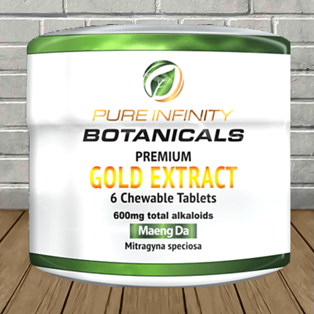 Pure Infinity Botanicals 45% Gold Extract Tablets come in a 6ct resealable jar. Each tablet contains 45mg of mitragynine and other alkaloids like paynantheine, speciogynine, mitraphylline, and others. All six tablets contain 600mg total alkaloids, which is more than their shot offers!