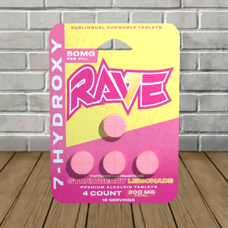 Want serious, no-nonsense potency with a side of flavor? The Rave 7-Hydroxy Tablets 200mg will be your new go-to! Each chewable tablet packs 50mg of 7-hydroxymitragynine, one of kratom’s strongest alkaloids. These kratom extract tablets are not here to play, so expect only real results. No need to brace yourself for that classic earthy bitterness either — these sublingual tablets come bursting with a sweet and tangy strawberry lemonade kratom tablet flavor that actually makes it a pleasure to pop one.