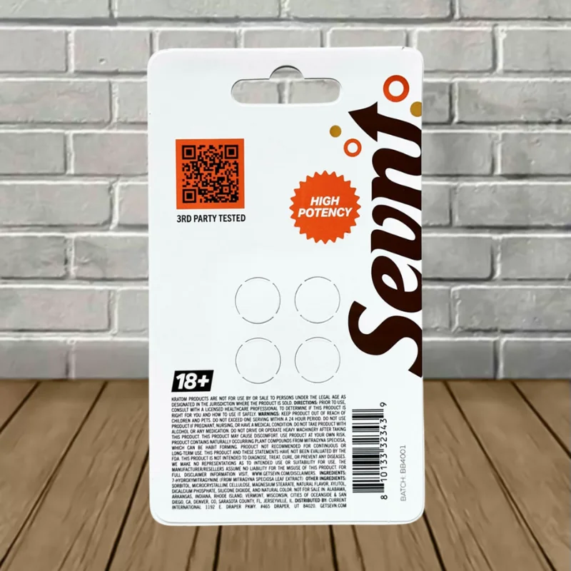 Sevn Ultra Strength 7-Hydroxy Chewable Extract Tablets Full Case comes in a sealed display box. Every sealed box includes ten 4ct blister packs of highly potent and precisely dosed ultra-strength rapid-release 7-OH. Each blister contains four tasty, chewable kratom extract tablets, scored down the center, providing two servings.